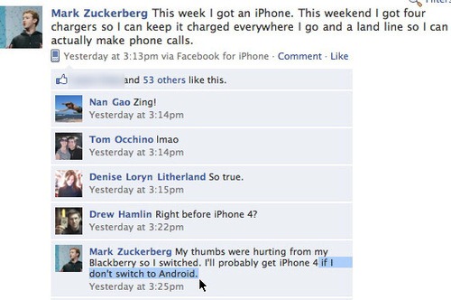 Mark Zuckerberg Profile on Facebook, June 2010And now according to his recent Facebook activity, it looks like he has finally gone for an Android phone.